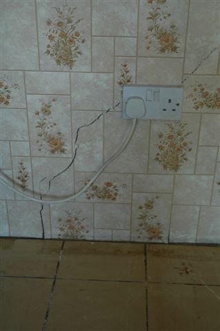 Cracking to an internal wall of a bungalow. The cracking was caused by settlement of the floor slab off which the wall was constructed.