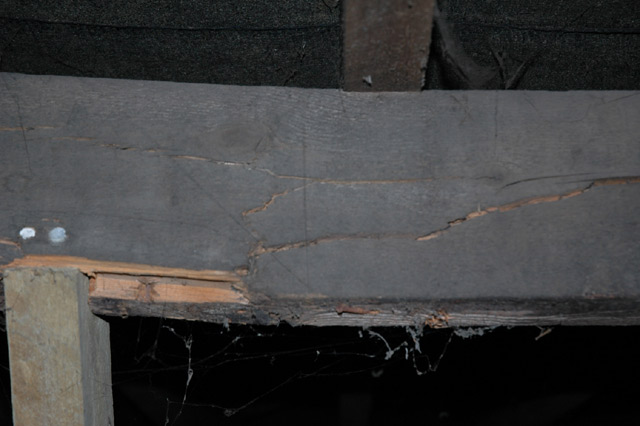 The timber (purlin) supporting the roof rafters has fractured due to the excessive load imposed by the concrete roof tiles.